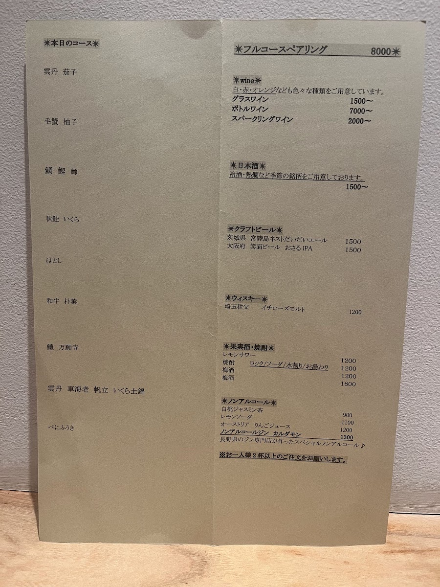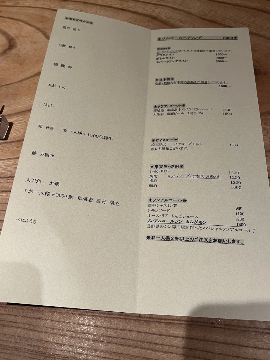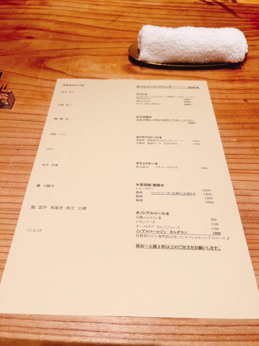 From a reviewer's perspective, the menu at Washoku Restaurant Iro Nakameguro offers a refined journey through seasonal Japanese cuisine, centered around the NEW 【旬の食材を使った土鍋付き】 フルコース 9品, a nine-item full course that highlights the freshest seasonal ingredients. Each dish is thoughtfully prepared, balancing traditional flavors with contemporary presentation, and the inclusion of a donabe (土鍋) adds a comforting, homey touch to the sophisticated tasting experience. While the menu emphasizes the elegance of multi-course dining rather than individual à la carte pricing, the attention to ingredient quality and careful curation of each course makes it clear that the price reflects both craftsmanship and the seasonal uniqueness of the offerings. Overall, the menu at Iro Nakameguro is a testament to Washoku dining at its finest, offering diners a memorable and meticulously structured culinary experience.